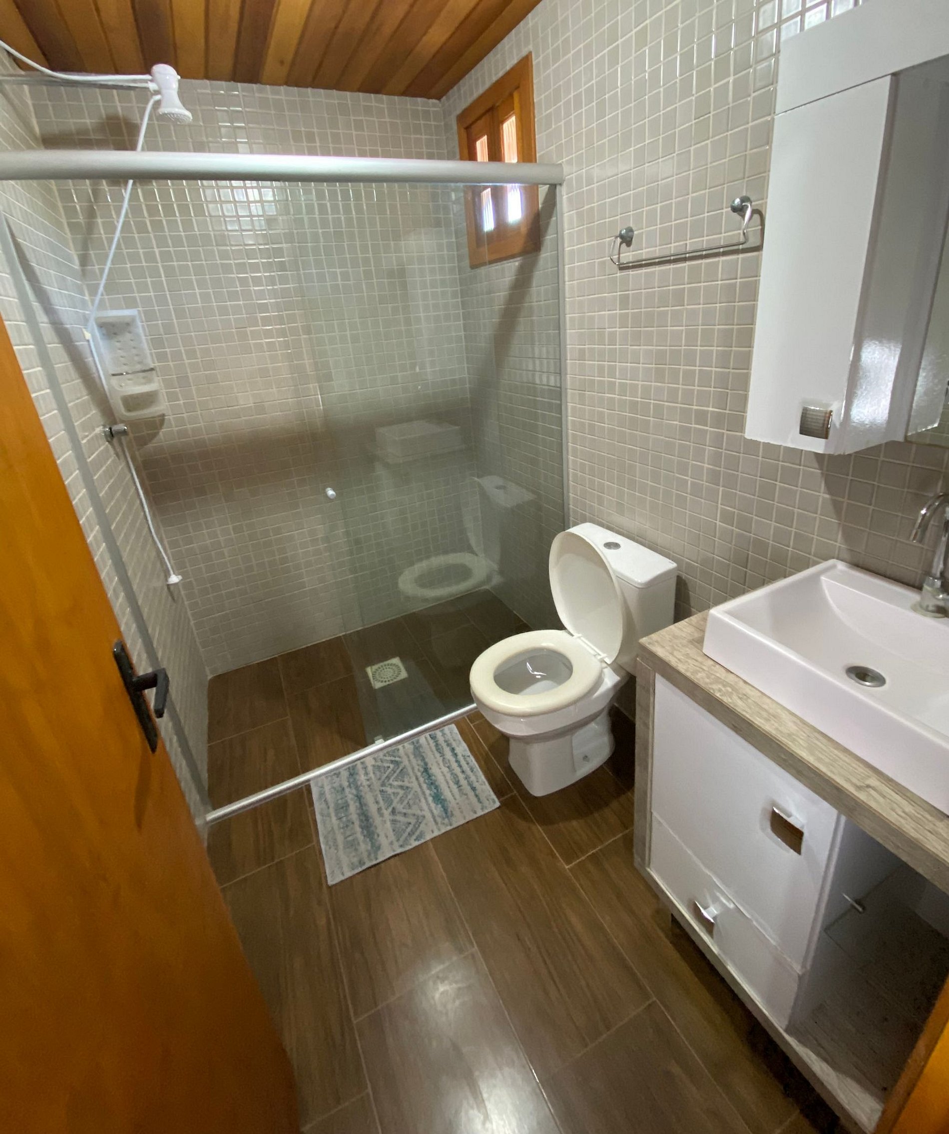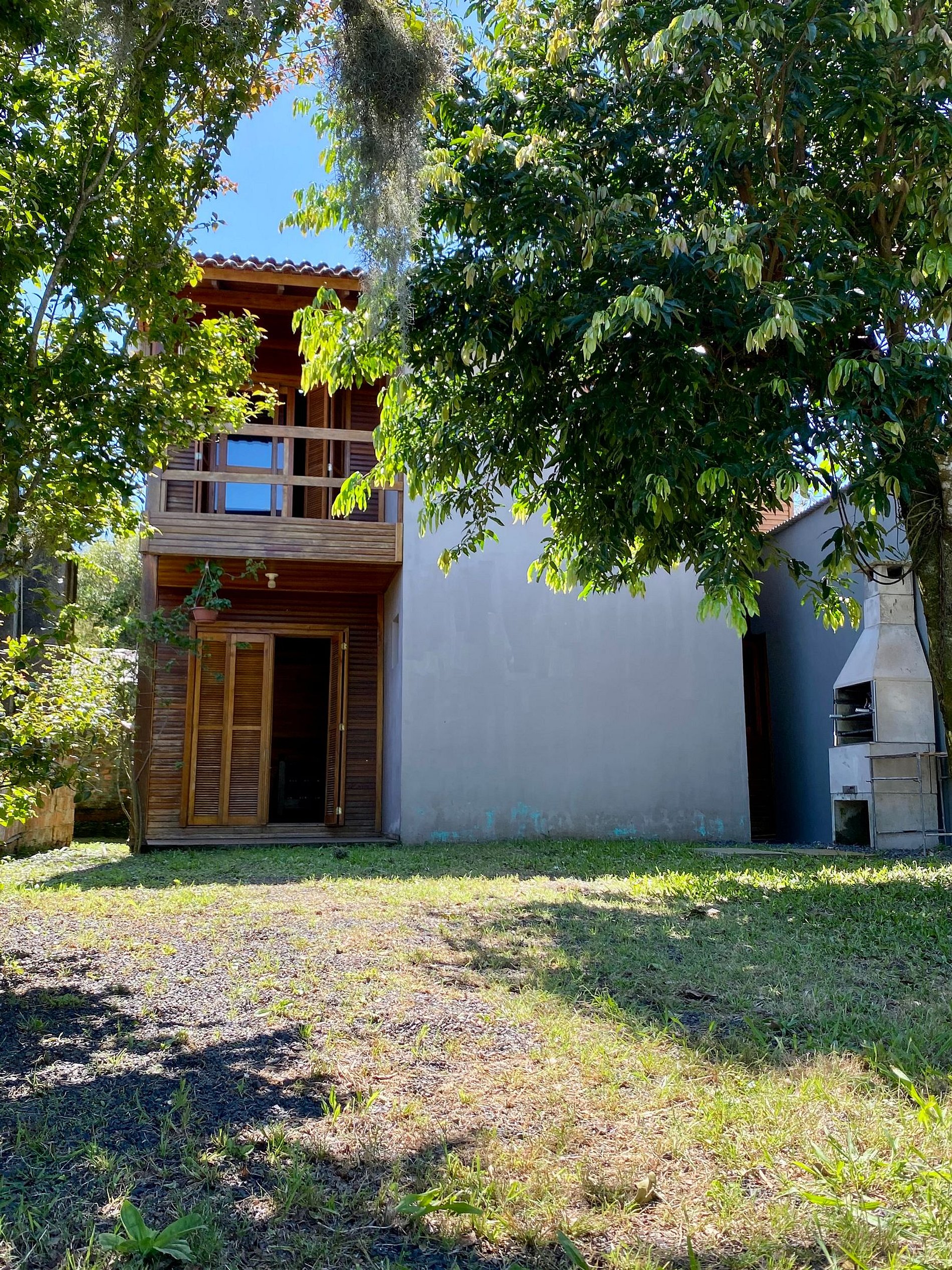 Linda casa de 2 pisos com vista para piscina, em cima tem 4 dormitórios e 1 banheiro e no térreo sala, cozinha e 1 banheiro. O pátio é aberto.